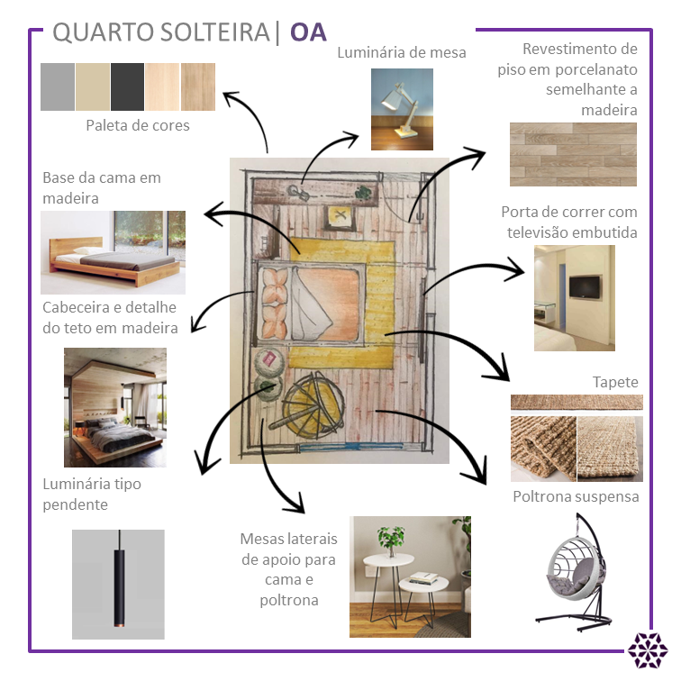 Este projeto de quarto foi elaborado para jovem solteira, com a finalidade de ser funcional e clean, sem deixar de ser confortável e acolhedor. A paleta de cores selecionada é composta de tons claros, deixando o ambiente visualmente elegante. As necessidades da cliente são atendidas, com espaço para leitura, descanso/lazer e trabalho.